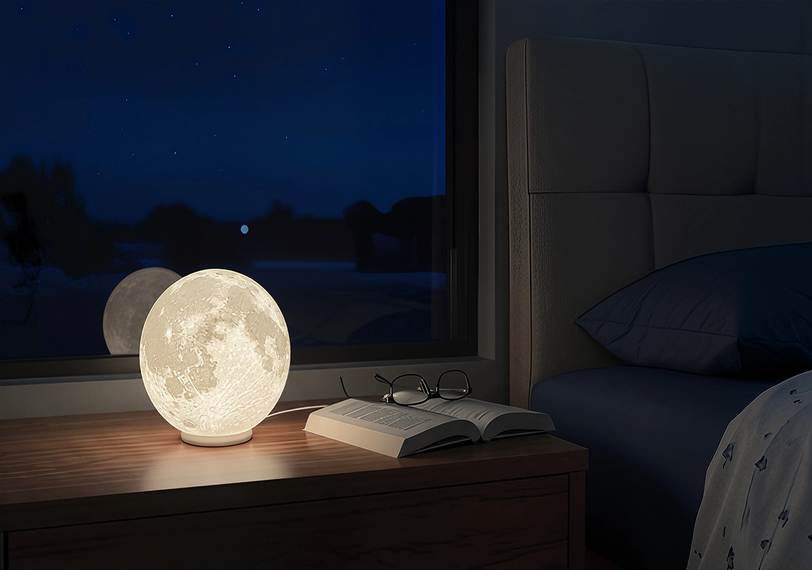 Ay LambasıGökyüzündeki huzur evinizde! Gerçekçi Ay yüzeyi dokusuna sahip bu Ay Lambası, yumuşak ve sıcak ışığıyla odanıza büyülü bir atmosfer katar. Modern tabanı ve sade tasarımıyla her dekorasyona kolayca uyum sağlar. Eşsiz bir gece lambası veya ortam aydınlatması arayanlar için mükemmel bir seçimdir.